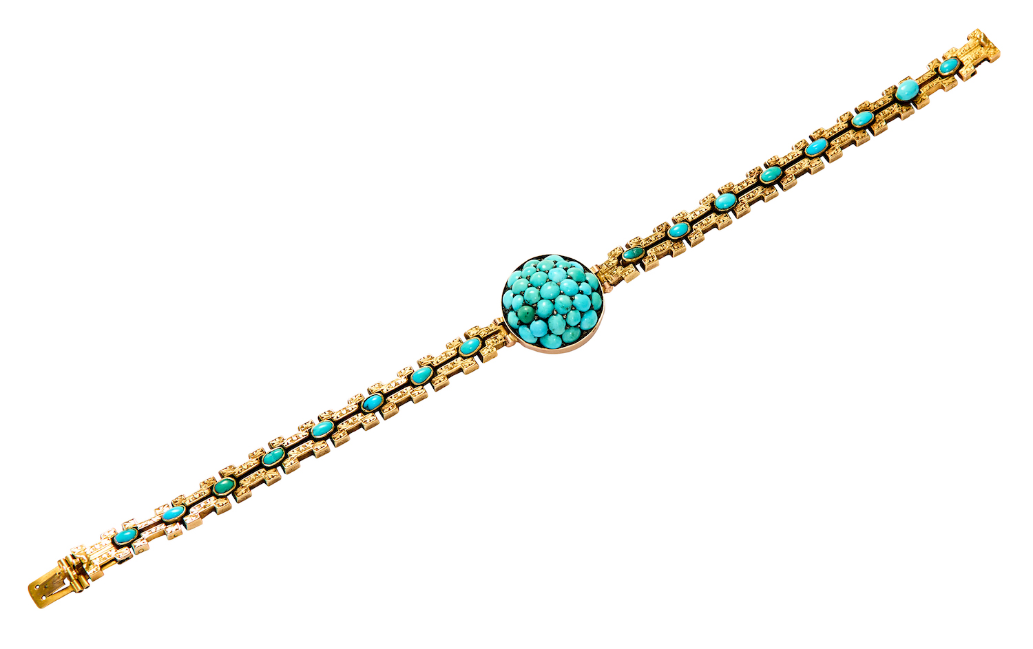 In our opinion, the bracelet is of very good craftsmanship. There is some variation to the colour of the turquoise cabochons throughout, with typical blemishes and some abrasions. Visible cracks to two of the oval cabochons. Light scratches, abrasions and minor nicks to the metal consistent with age and wear. One of the links is slightly misshapen, not visible when worn. The clasp is in good working order.