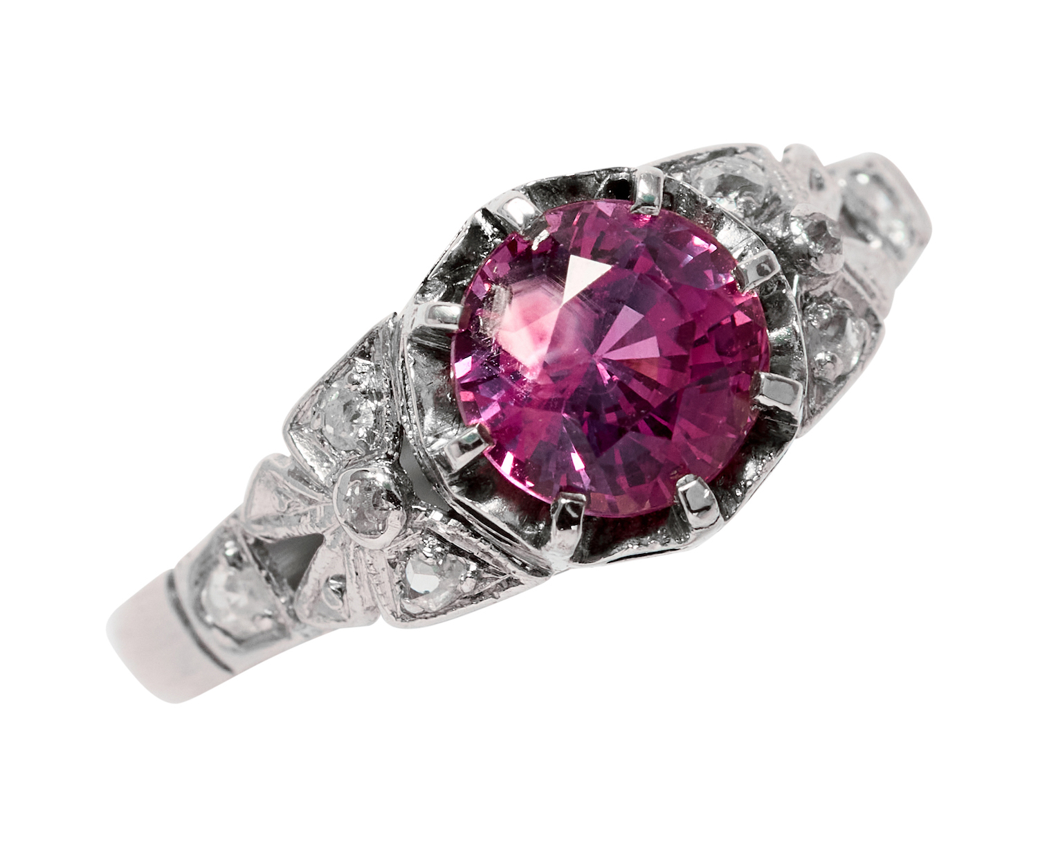 Centring a claw-set round mixed-cut pink sapphire weighing approximately 1.39 carats, flanked by bow motif shoulders set with old-cut diamonds together weighing approximately 0.08 carats, mounted in 18ct white gold and platinum, size M, total gross weight approximately 3 grams.
