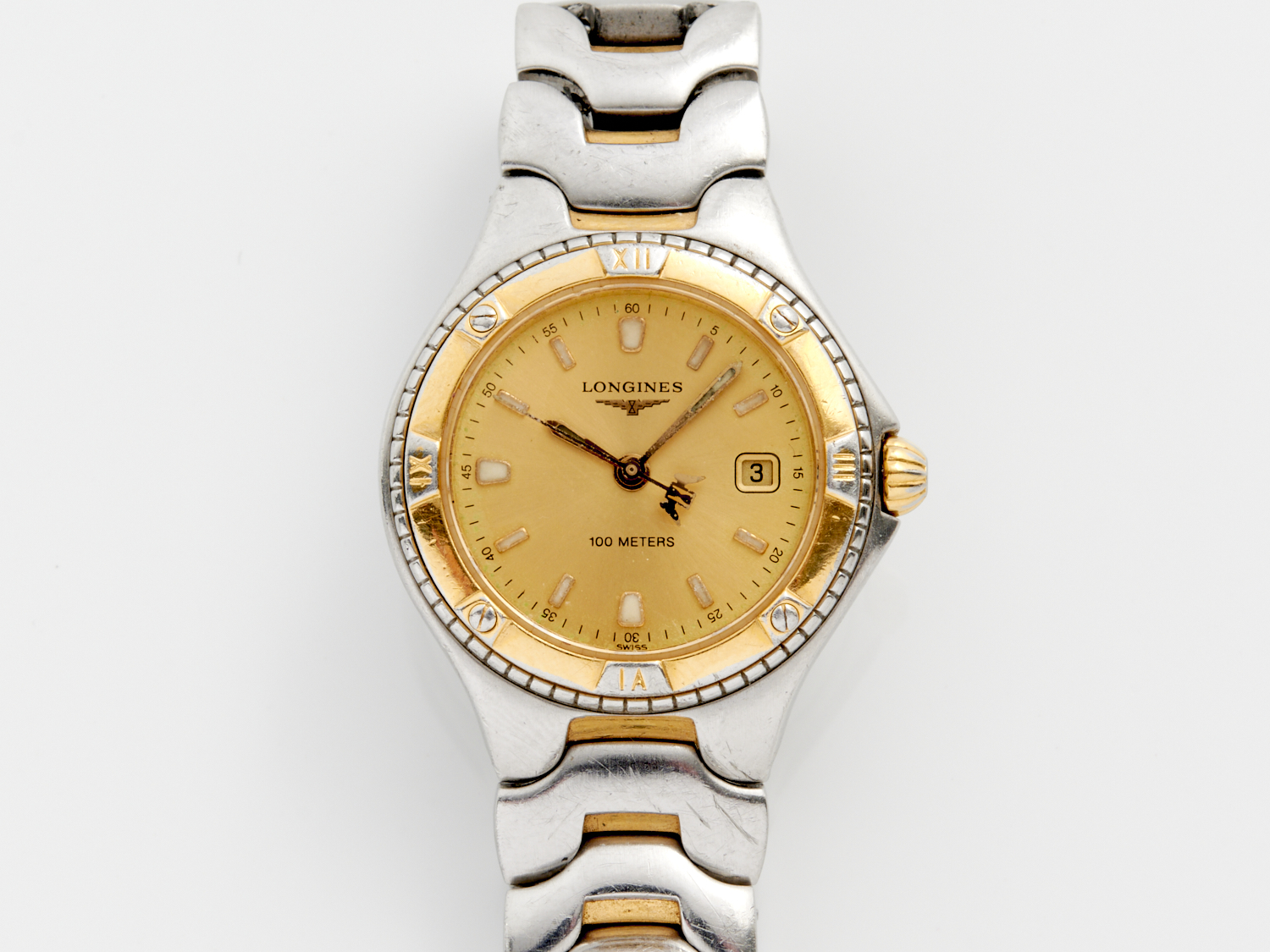 LONGINES, A LADY'S WRISTWATCH IN TWO TONE STAINLESS STEEL, DATE APPERTURE AT THREE, QUARTZ MOVEMENT, THE DIAL MEASURING APPOXIMATELY 25MM