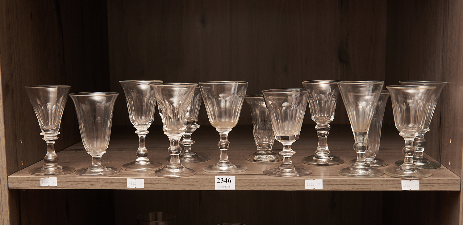 A GROUP OF THIRTEEN GEORGIAN-STYLE SLICE-CUT WINE GLASSES OF VARIOUS SHAPES AND SIZES H.12CM (TALLEST), LEONARD JOEL LOCAL DELIVERY: MEDIUM