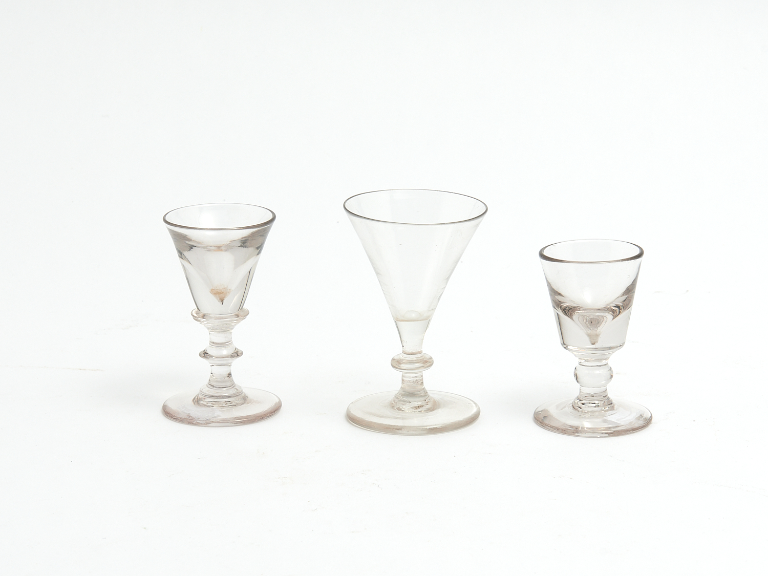 A GROUP OF THREE GEORGIAN WINE GLASSES, TWO WITH DECEPTIVE BOWLS H.10CM (TALLEST), LEONARD JOEL LOCAL DELIVERY: SMALL