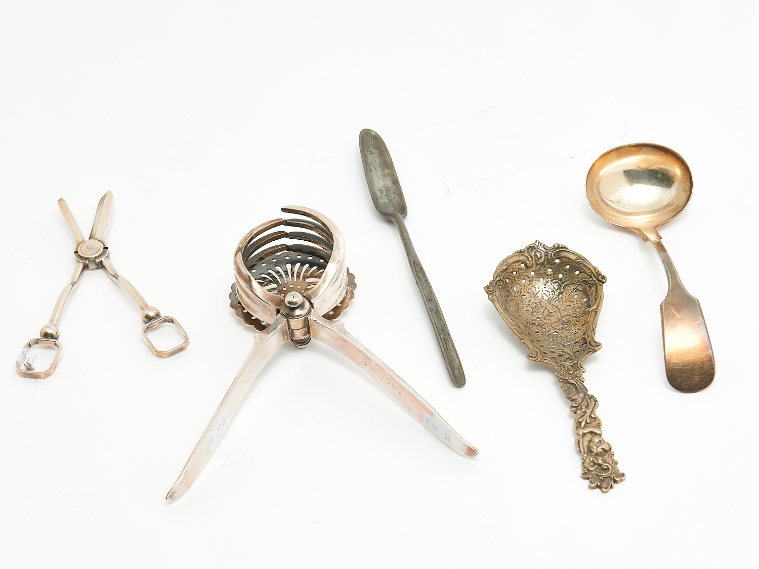 A GROUP OF ASSORTED SERVING UTENSTILS, INCLUDING A GEORGIAN PEWTER MARROW SPOON, FRENCH LEMON PRESS AND GRAPE SCISSORS L.23CM (LONGEST), LEONARD JOEL DELIVERY SIZE: SMALL