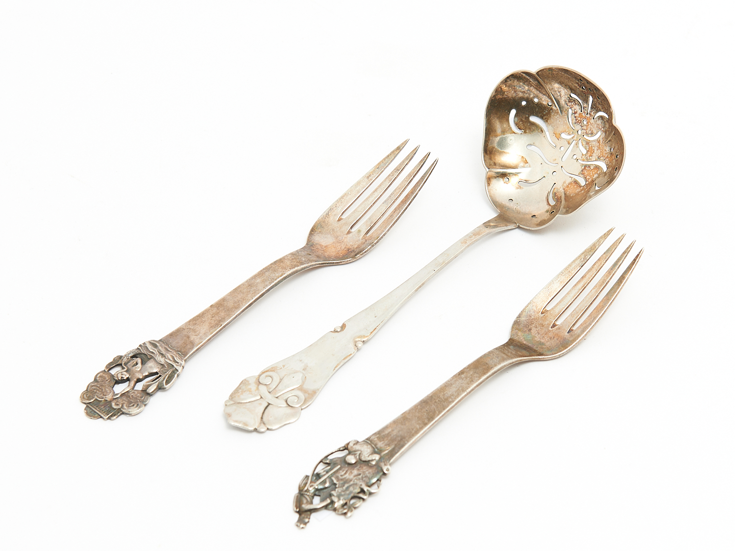 A PAIR OF 1930S DANISH SILVER FORKS WITH ART DECO TERMINALS AND A DANISH SILVER STRAINING LADLE L.16.5CM (LONGEST), 106G (IN TOTAL), LEONARD JOEL DELIVERY SIZE: SMALL