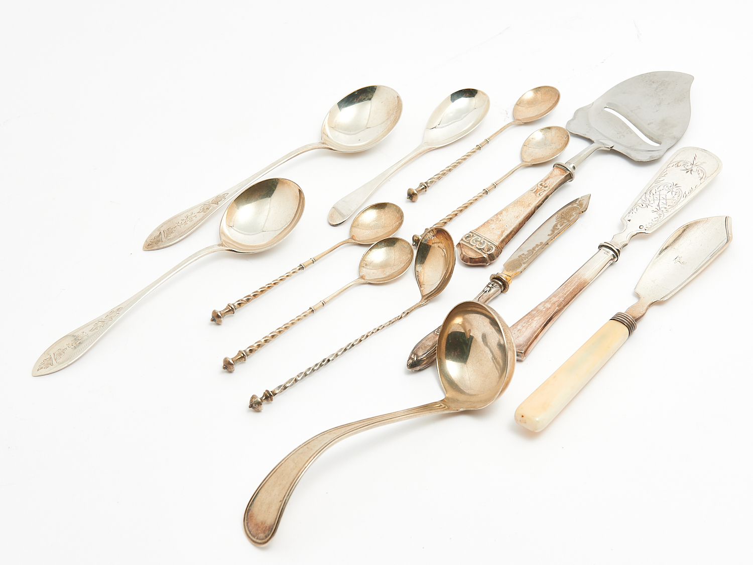 A GROUP OF ASSORTED SILVER SPOONS AND SERVING UTENSILS OF VARIOUS DESIGNS, ORIGIN AND FINENESS BETWEEN 800 AND 925 L.21.5CM (LONGEST), LEONARD JOEL DELIVERY SIZE: SMALL