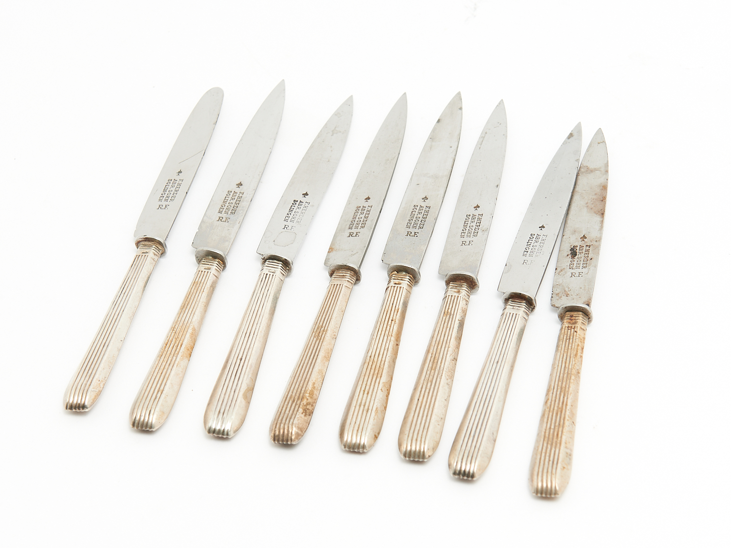 A SET OF EIGHT SMALL GERMAN SILVER KNIVES, ALL BUT ONE POINTED L.16.5CM (LONGEST), LEONARD JOEL DELIVERY SIZE: SMALL