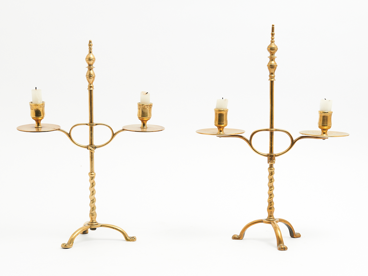 TWO SIMILAR 19th CENTURY BRASS TWO-LIGHT CANDLESTICKS, OF ADJUSTABLE HEIGHT ON TRIPOD STEMS H.40CM, LEONARD JOEL LOCAL DELIVERY: SMALL