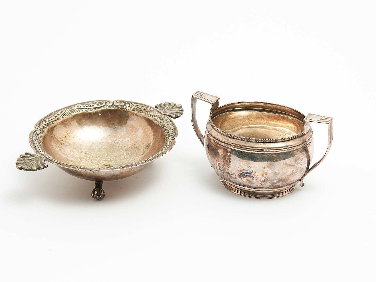 A LATE 19th / EARLY 20th CENTURY SILVER PLATE BOWL ON FEET AND A SILVER PLATE SUGAR BASIN OF SIMILAR PERIOD L.23CM (LONGEST), LEONARD JOEL LOCAL DELIVERY: SMALL