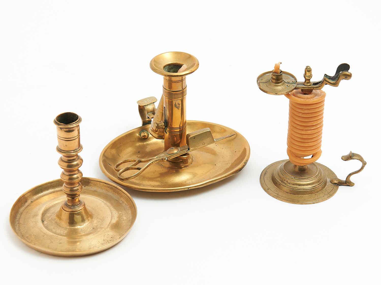 A 19th CENTURY BRASS WAX JACK, A BRASS EJECTOR CHAMBER STICK WITH WICK SCISSORS AND SNUFFER, AND ANOTH ANOTHER ANTIQUE BRASS CANDESTICK H.13.5CM (TALLEST), LEONARD JOEL LOCAL DELIVERY: SMALL