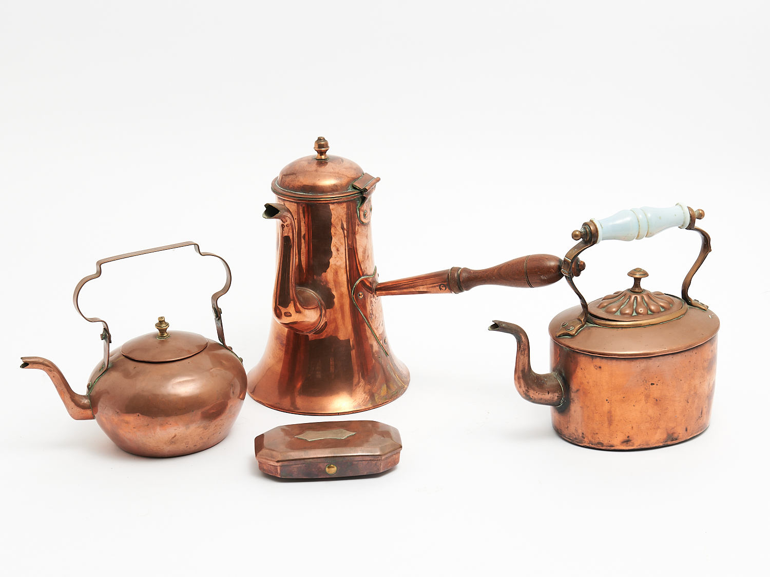 A LATE GEORGE III COPPER COFFEE POT, TWO 19th CENTURY COPPER TEA POTS, AND A COPPER BOX H.25.5CM (TALLEST), LEONARD JOEL LOCAL DELIVERY: MEDIUM