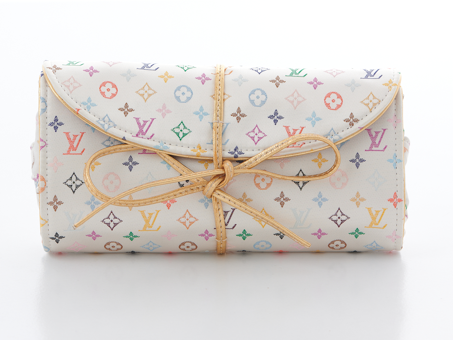 LOUIS VUITTON, A JEWELLERY WRAP IN MONOGRAM SILK WITH GOLD LEATHER TRIM AND ALACANTRA INTERIOR