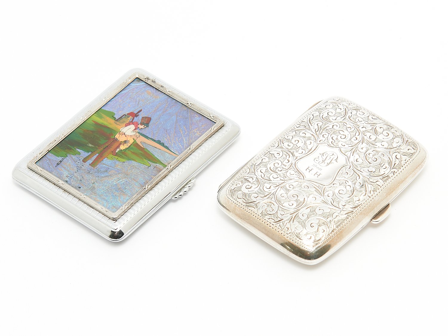 TWO CARD CASES, ONE STERLING SILVER AND THE OTHER EP WITH ENAMEL DECORATION L.7.5CM, 64G (STERLING SILVER), LEONARD JOEL LOCAL DELIVERY: SMALL