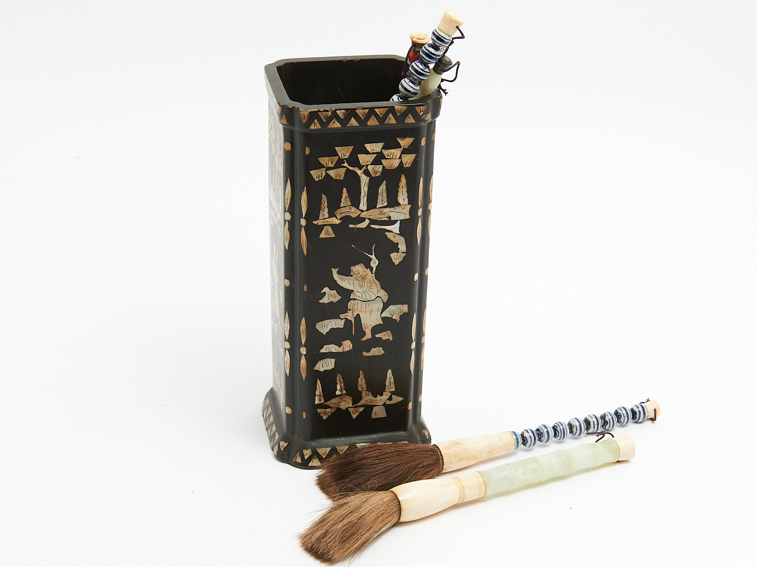 A CHINESE LACQUERED MOTHER-OR-PEARL INLAID BRUSH POT WITH FIVE CALLIGRAPHY BRUSHES H.27.5CM (POT), LEONARD JOEL LOCAL DELIVERY: MEDIUM