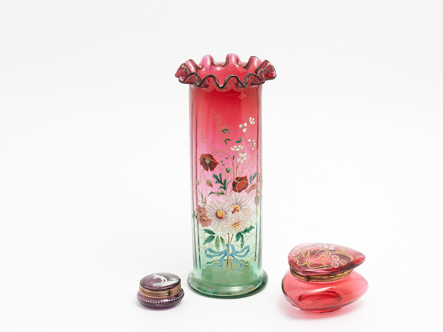 A FRENCH ANTIQUE GLASS AND ENAMEL FLORAL DECORATED VASE TOGETHER WITH TWO GLASS ENAMEL DECORATED BOXES H.30CM (VASE), LEONARD JOEL LOCAL DELIVERY: MEDIUM