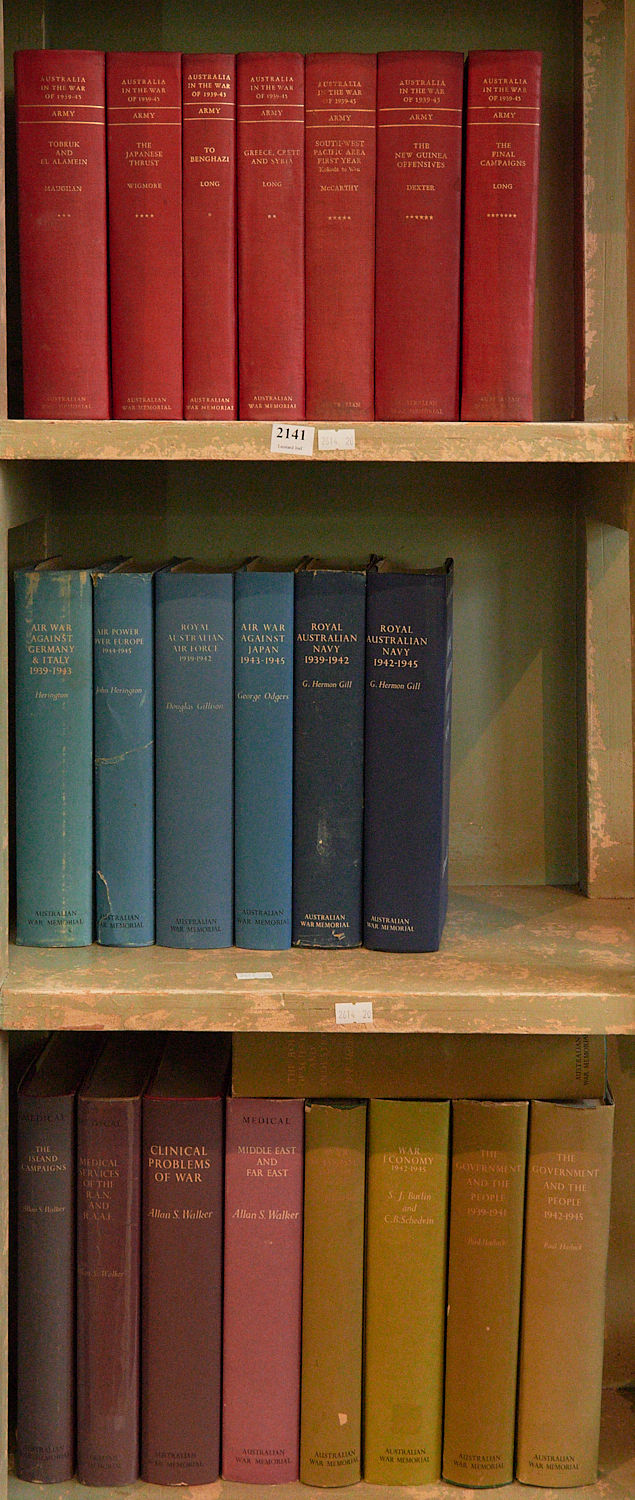 A LARGE SET OF THE A.W.M. 'AUSTRALIA IN THE WAR OF 1939-45' SERIES, COMPRISING THE SERIES ON THE ARMY, THE R.A.A.F., THE R.A.N., THE MEDICAL SERIES, AND THE POLITICAL AND ECONOMIC SERIES (22 VOLS), LEONARD JOEL DELIVERY SIZE: MEDIUM