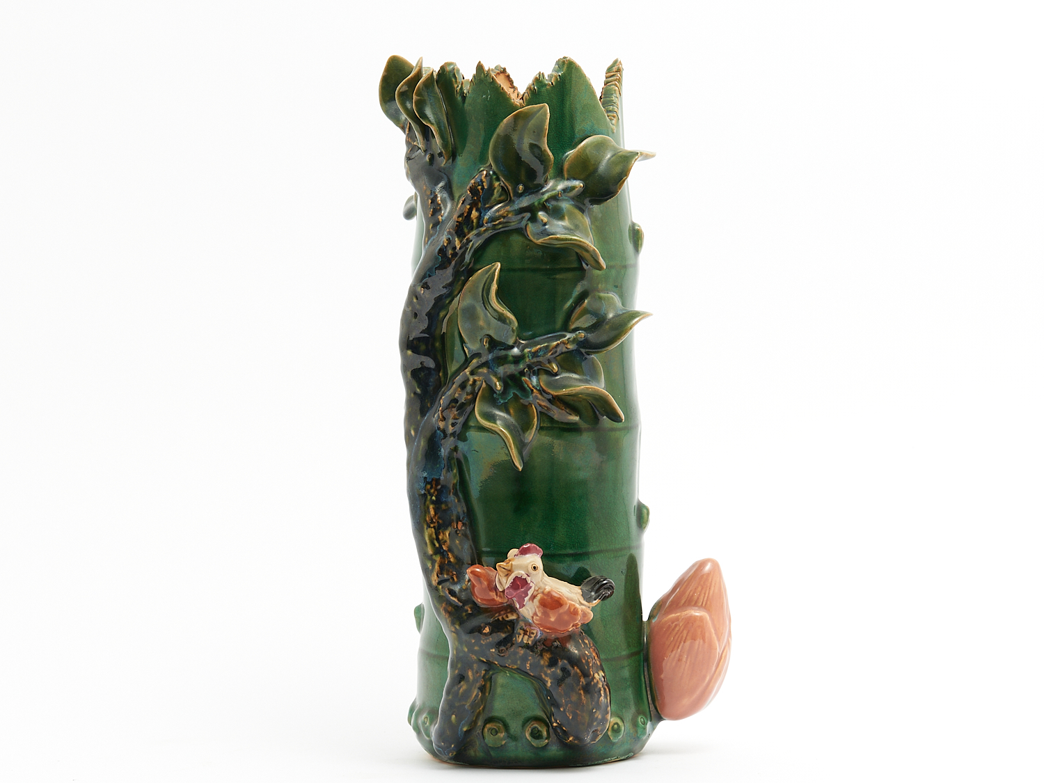 A SIGNED POTTERY BAMBOO-FORM VASE ADORNED WITH FOLIAGE H.35CM, LEONARD JOEL LOCAL DELIVERY: SMALL