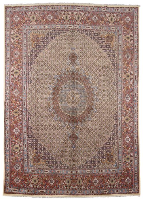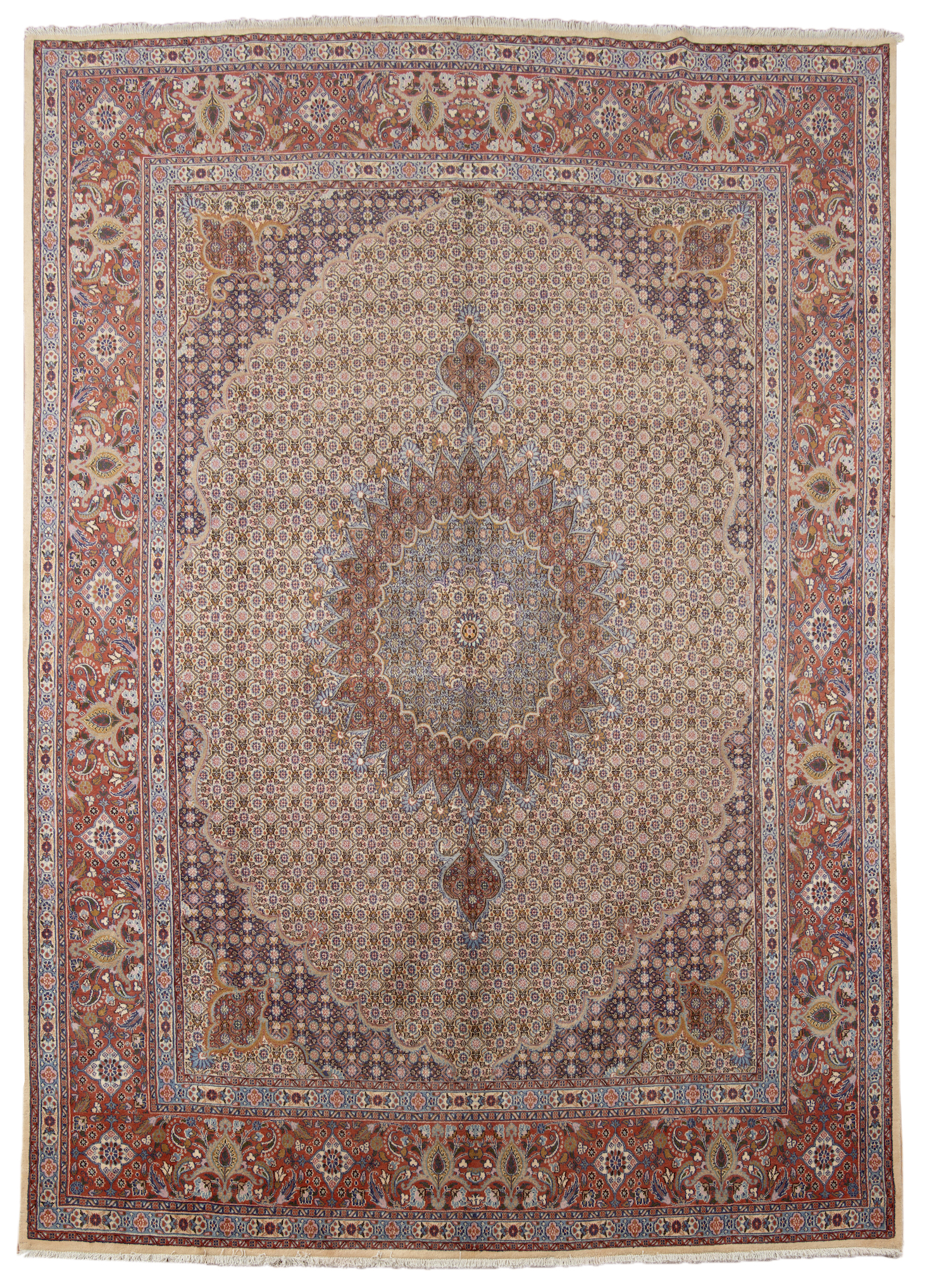A BEAUTIFUL NEW SUPERFINE FINE HAND-KNOTTED PERSIAN BIRJAND MOOD CARPET, 100% WOOL WITH SILK INLAYS. SOLID DENSE PILE. CLASSIC MOOD DESIGN OF ELONGATED SUNBURST MEDALLION QUARTERED CORNER MEDALLIONS IN FRENCH BLUE, SOFT RED AND CREAM, IN A FIELD OF ALL OVER FLORAL HERATI MAHI PATTERNS IN TONES OF ROSE, SAGE GREEN AND FRENCH BLUE. BORDER OF INTRICATE FLORAL PALMETTES, PAISLEY AND DIAMOND ROSETTES. EX GALLERY RUG. SIZE: 353 X 252 CM ORIGIN: PERSIA – RRP: $7,900 DOCUMENTATION OF AUTHENTICITY INCLUDED.
