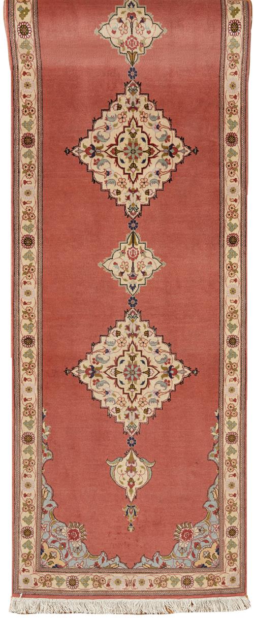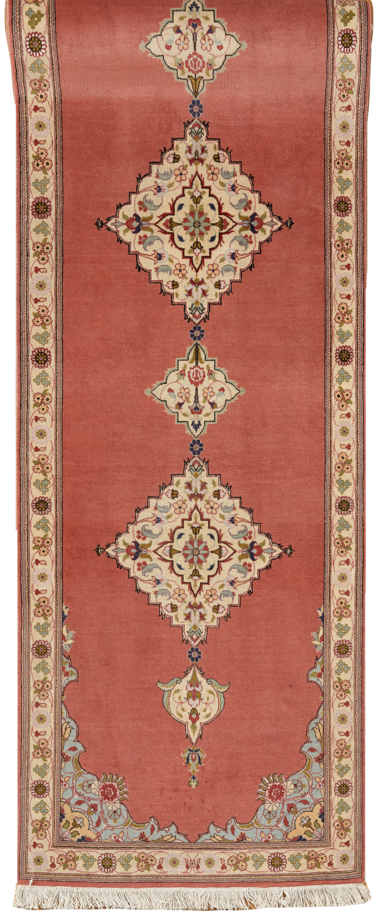 A WONDERFUL RARE PERSIAN QUM RUNNER, 100% LAMBS WOOL WITH PURE CASPIAN SILK HIGHLIGHTS. CONTINUING ANTIQUE DIAMOND MEDALLIONS ON A DEEP CORAL FIELD. BEAUTIFUL CORNER MEDALLIONS FLORAL MEDALLIONS IN FRENCH BLUE, SAGE GREEN AND RUST. BORDER OF DAISY FLORAL MOTIFS. SIZE: 300 X 80 CM - ORIGIN: PERSIA - RRP: $3,700