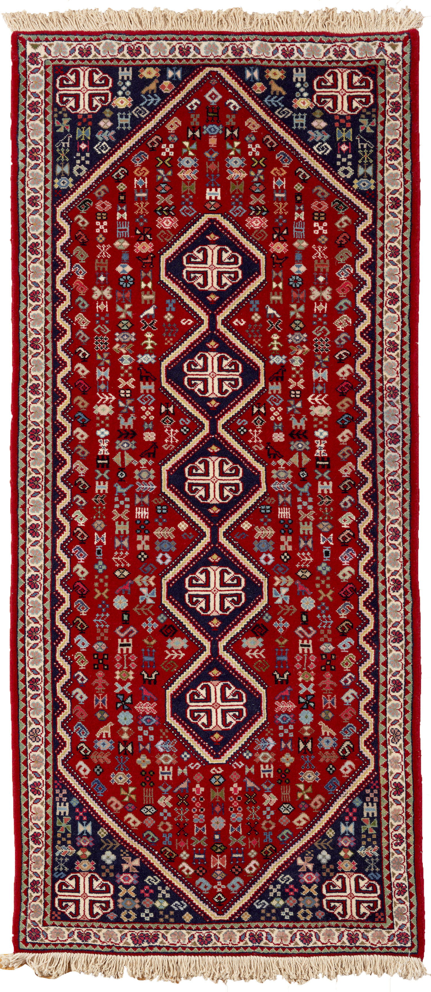 A PERSIAN ABADEH HEYBATLOU RUNNER, 100% WOOL, WITH INTRICATE MOTIFS, CONSISTING OF PAISLEY BUTTERFLIES AND FLORAL MOTIFS. DIAMOND LINKED MEDALLIONS CONTAINING AMULETS ON A RICH DECORATIVE RED FIELD OUTLINED WITH INDIGO BLUE CORNER MEDALLIONS. SIZE: 196 X 83 CM ORIGIN: PERSIA – RRP: $1,100 DOCUMENTATION OF AUTHENTICITY INCLUDED.