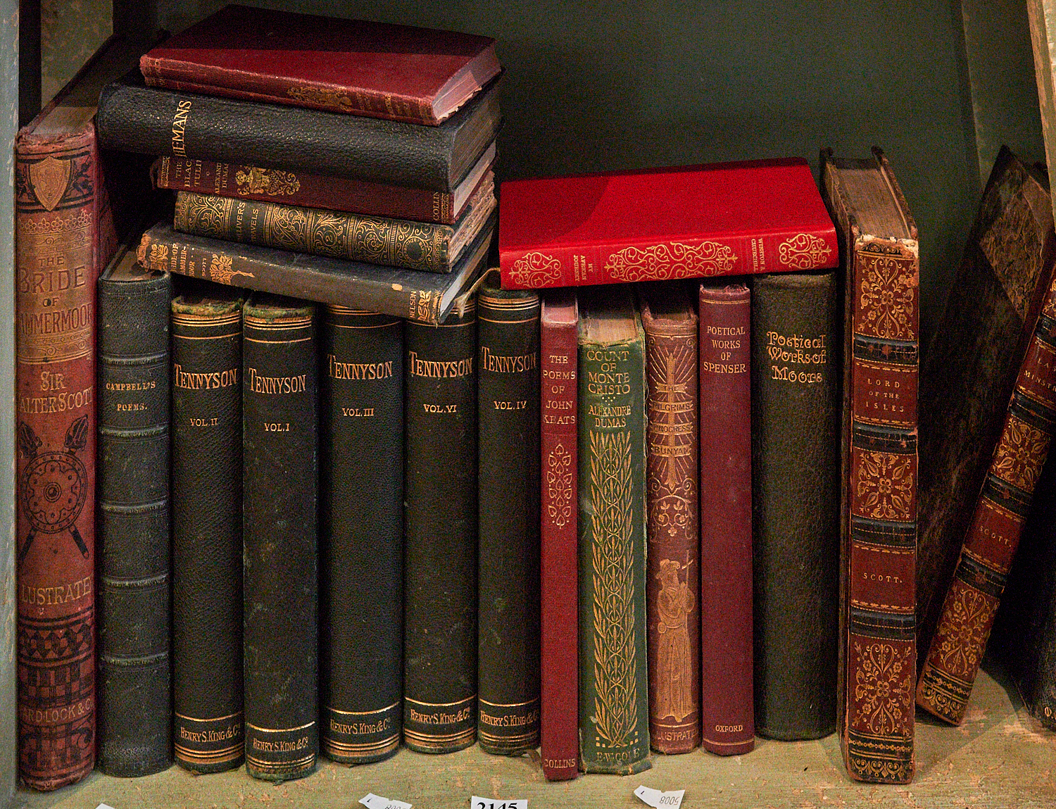 A COLLECTION OF ANTIQUE BINDINGS AND LATER INCLUDING FIVE VOLUMES ON TENNYSON, SIR WALTER SCOTT AND POE'S POETICAL WORKS, LEONARD JOEL LOCAL DELIVERY: MEDIUM