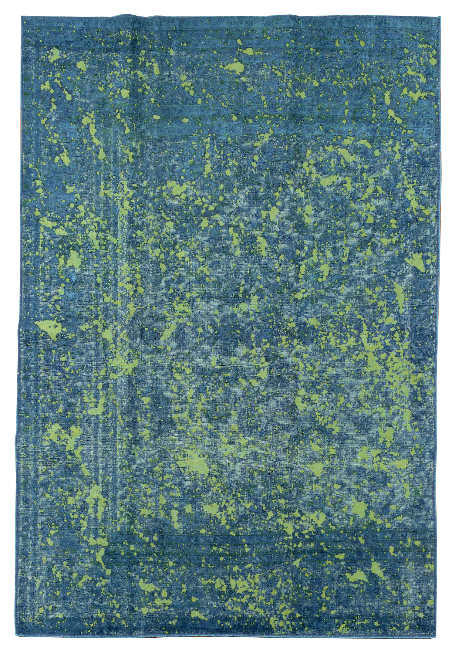 A MODERN OVER-DYED VINTAGE PERSIAN KERMAN CARPET. EX-GALLERY EXHIBITED. CREATED FROM A FINELY HAND- KNOTTED VINTAGE DESIGN PERSIAN KERMAN CARPET. THE PILE IS SHORN AND OVER-DYED IN BLUE TEAL AND GREEN GRASS TONES. SIZE: 279 X 181 CM ORIGIN: PERSIA – RRP: $5,900 DOCUMENTATION OF AUTHENTICITY INCLUDED