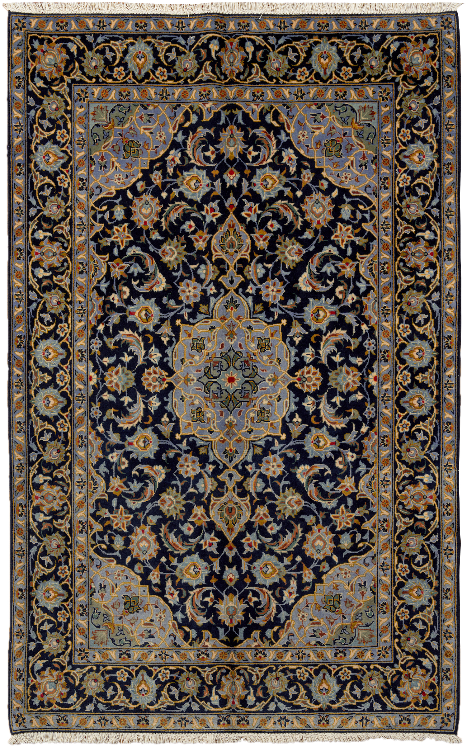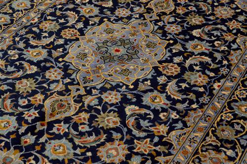 A PERSIAN ‘ROSE GARDEN' DESIGN KASHAN CARPET. WITH 100% WOOL PILE SOLID AND DENSELY HAND KNOTTED IN TRADITIONAL DESIGN OF CENTRAL ELONGATED MEDALLION IN FRENCH BLUE, GOLD AND SAGE GREEN ON A DEEP NAVY FIELD OF ALL OVER SHA ABBASI PALMETTES AND SAZ LEAVES IN TONES OF CHAMPAGNE, GOLD AND FRENCH BLUE. SIZE: 220 X 138 CM ORIGIN: PERSIA – RRP: $2,900 DOCUMENTATION OF AUTHENTICITY INCLUDED.