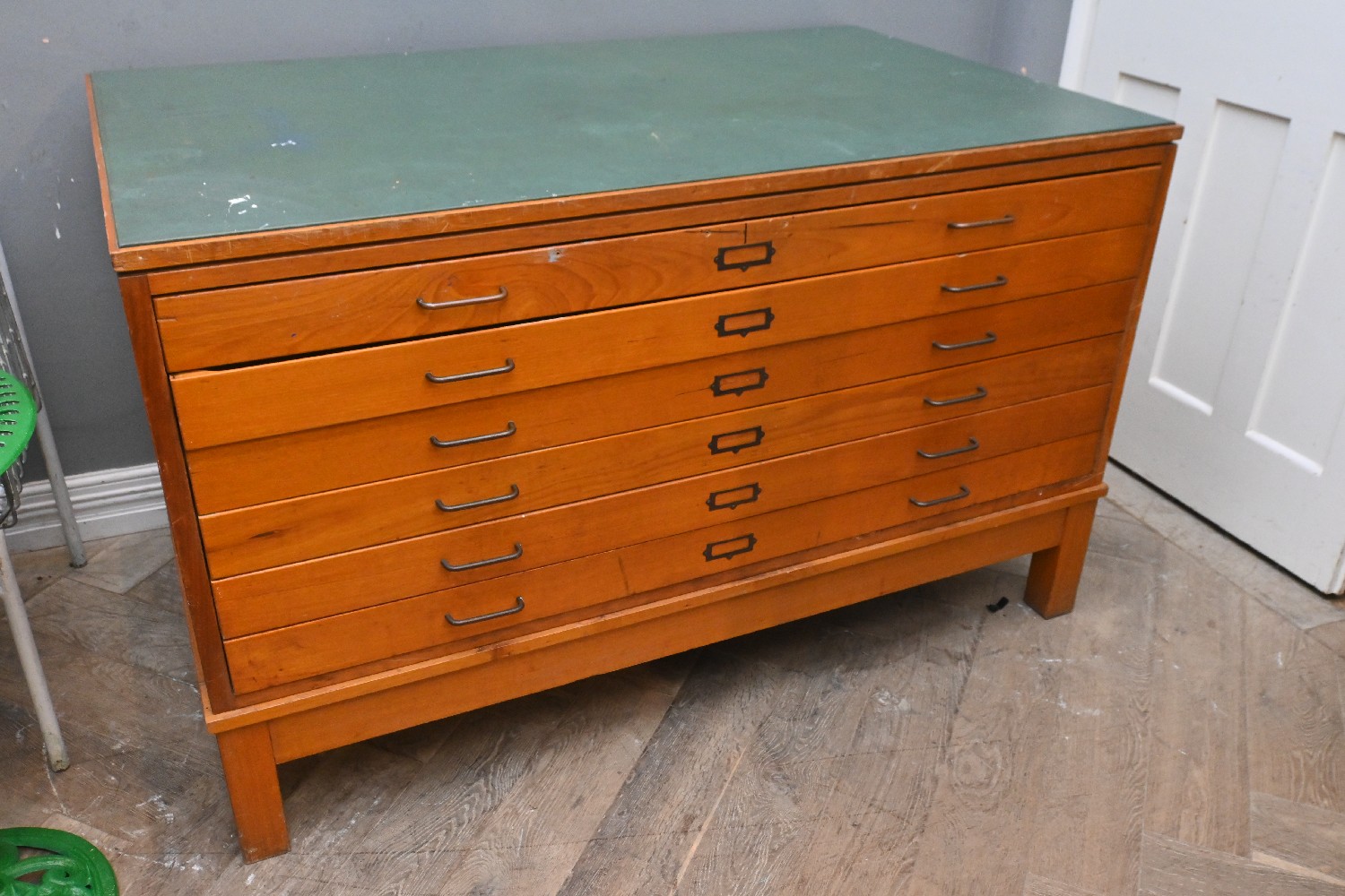 A MID-20th CENTURY HARDWOOD CHEST OF PLAN DRAWERS (92CM H X 151CM W X 93CM D) (PLEASE NOTE THIS HEAVY ITEM MUST BE REMOVED BY CARRIERS AT THE CUSTOMER'S EXPENSE. LEONARD JOEL STAFF CANNOT ASSIST CARRYING THIS ITEM) (X-LARGE ITEM)