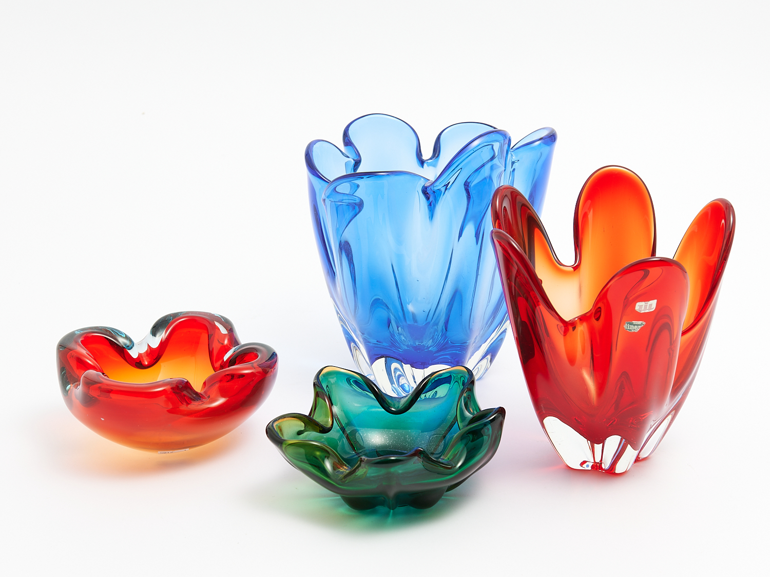 FOUR ART GLASS VASES INCLUDING ONE JAPANESE H.19CM, LEONARD JOEL LOCAL DELIVERY: MEDIUM