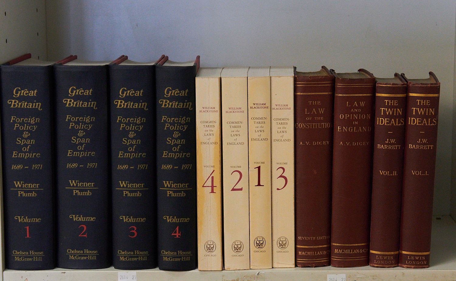 A SHELF OF BOOKS ON BRITISH FOREIGN POLICY, ENGLISH LAW ETC, LEONARD JOEL DELIVERY SIZE: LARGE