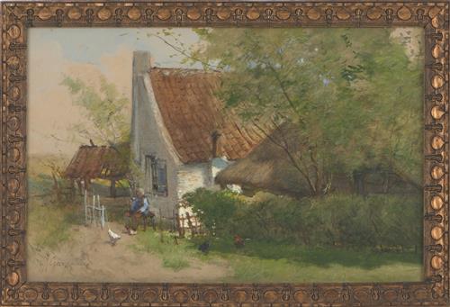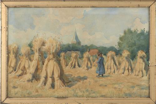 TWO ARTWORKS: JOHANNES JOSEPHUS GARJEANNE, A FIGURE SITTING IN COTTAGE GARDEN WITH CHICKENS, PASTEL, WATERCOLOUR AND GOUACHE, SIGNED LOWER LEFT, 23.5 X 36.5CM & EUROPEAN SCHOOL, A GIRL STANDING IN A FIELD OF WHEAT STOOKS, WATERCOLOUR, INDISTINCTLY SIGNED LOWER LEFT, 28 X 44CM