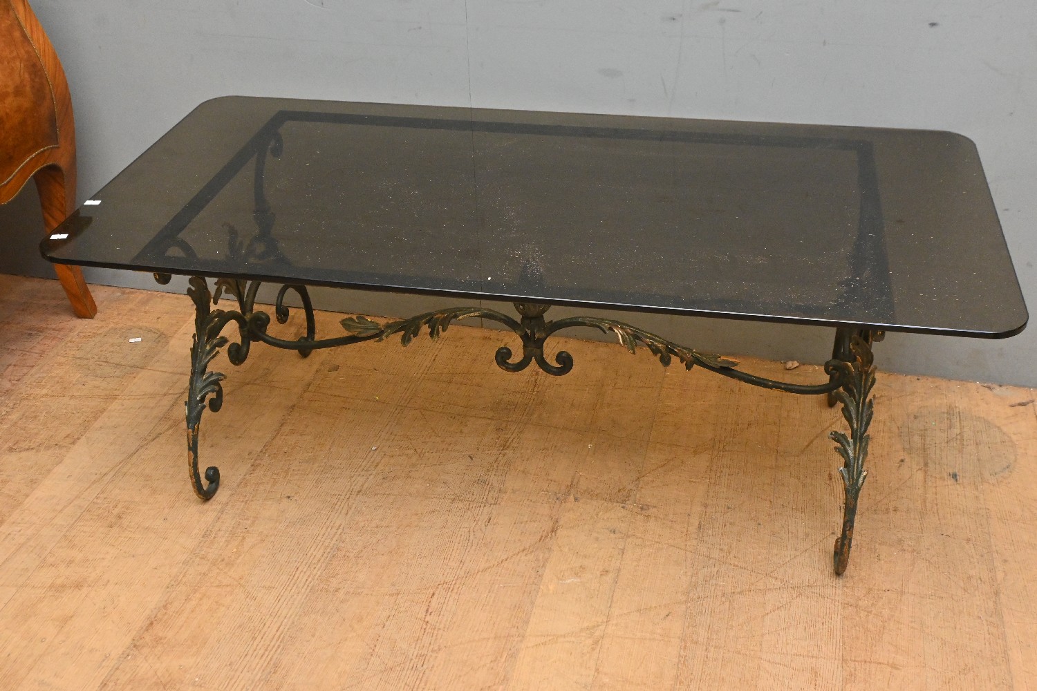 A WROUGHT IRON BASED GLASS TOP COFFEE TABLE (47CM H X 130CM W X 60CM D) (LEONARD JOEL DELIVERY SIZE: X- LARGE)