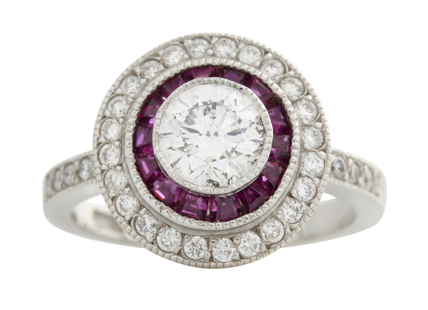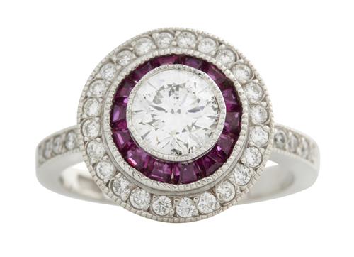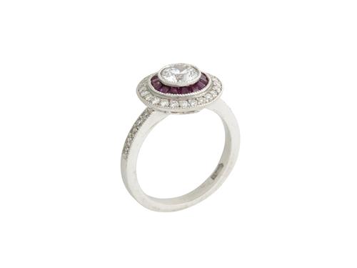 Of cluster design, centring a collet-set brilliant-cut diamond within a surround of calibre-cut rubies and brilliant-cut diamonds to diamond set shoulders, the rubies together weighing approximately 0.70 carats, the diamonds together weighing approximately 1.21 carats, size M.