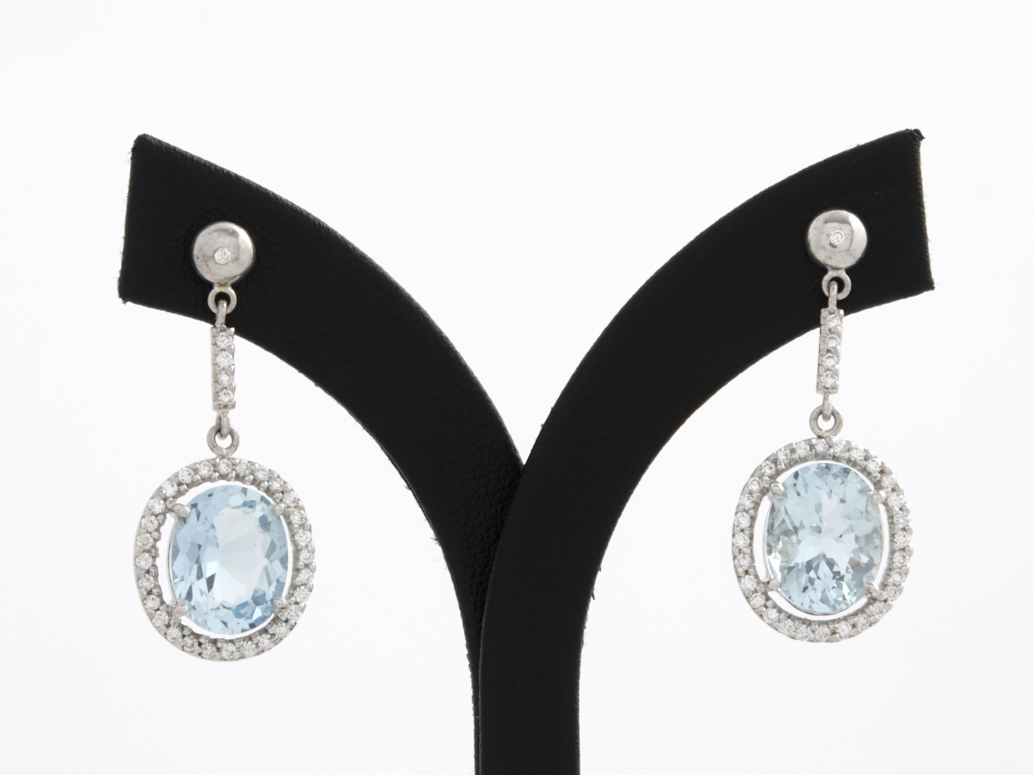 A PAIR OF AQUAMARINE AND DIAMOND EARRINGS IN 9CT GOLD, TO POST AND BUTTERFLY FITTINGS, LENGTH 30MM