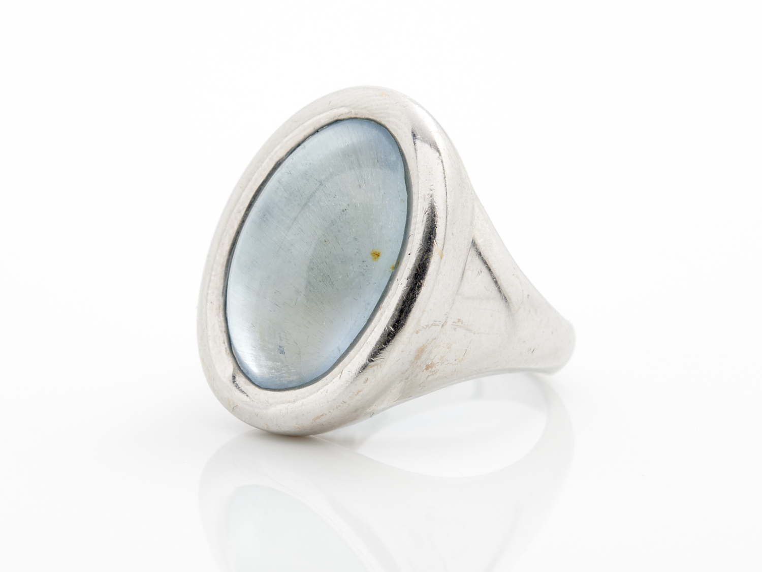 A CABOCHON AQUAMARINE RING IN 18CT WHITE GOLD, THE AQUAMARINE MESURING 19 X 13MM, SIZE Q, 16.4GMS
