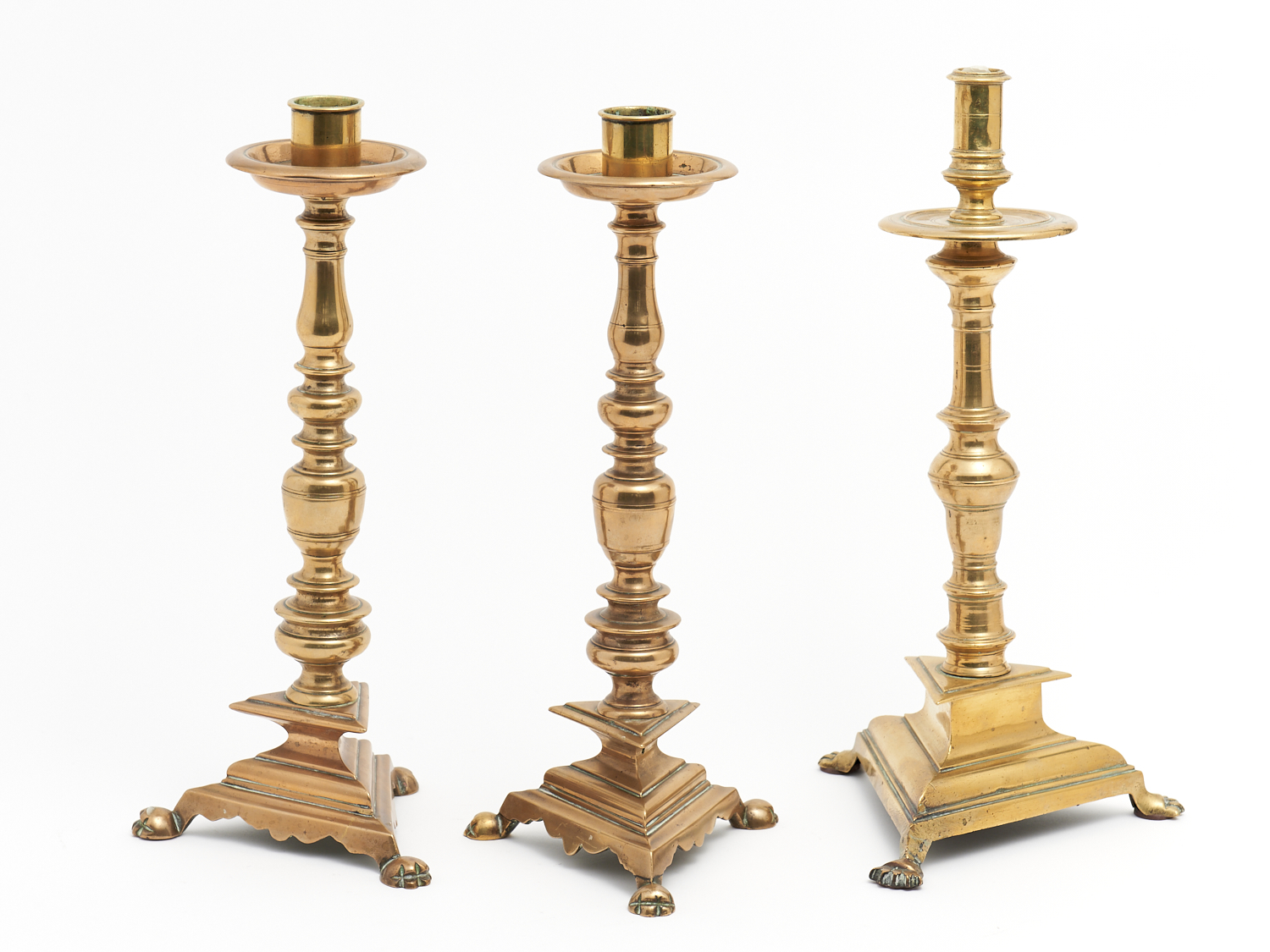 A PAIR OF 19th CENTURY TURNED SOLID BRASS CANDLESTICKS, AND ANOTHER SIMILAR H.36.5CM (TALLEST), LEONARD JOEL DELIVERY SIZE: MEDIUM