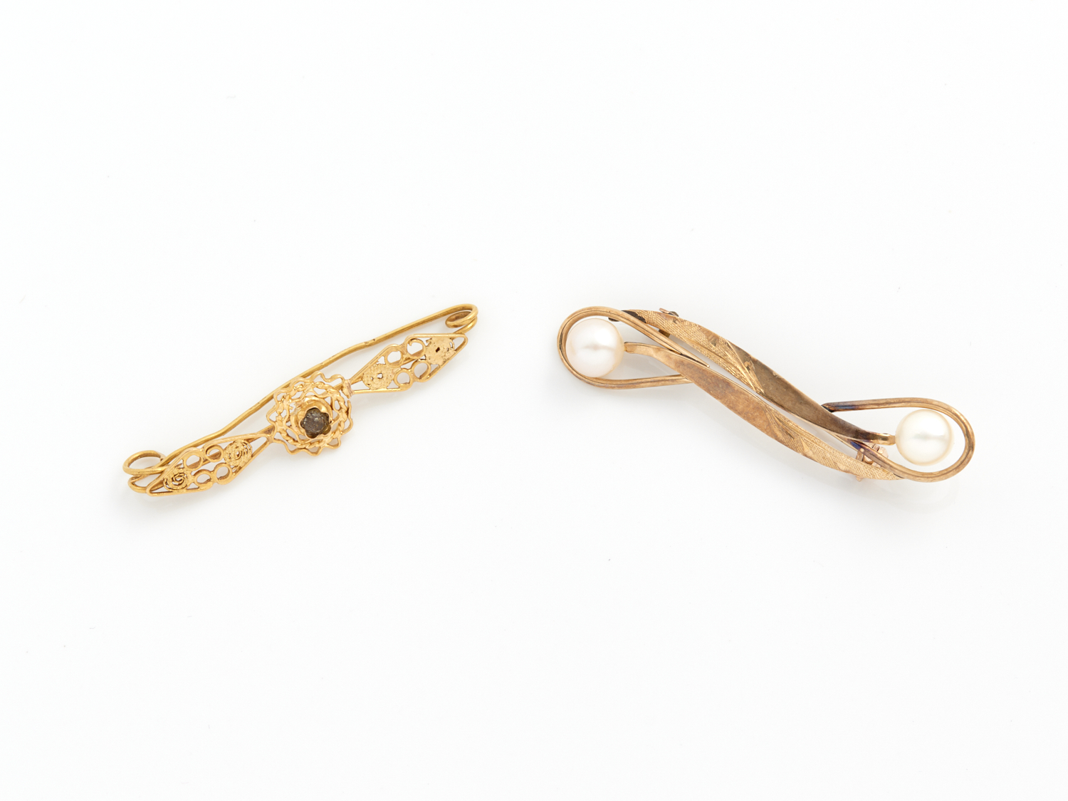 A GEM-SET BROOCH IN 18CT GOLD, TOGETHER WITH A CULTURED PEARL BROOCH IN 9CT GOLD, TOTAL WEIGHT 4.9GMS