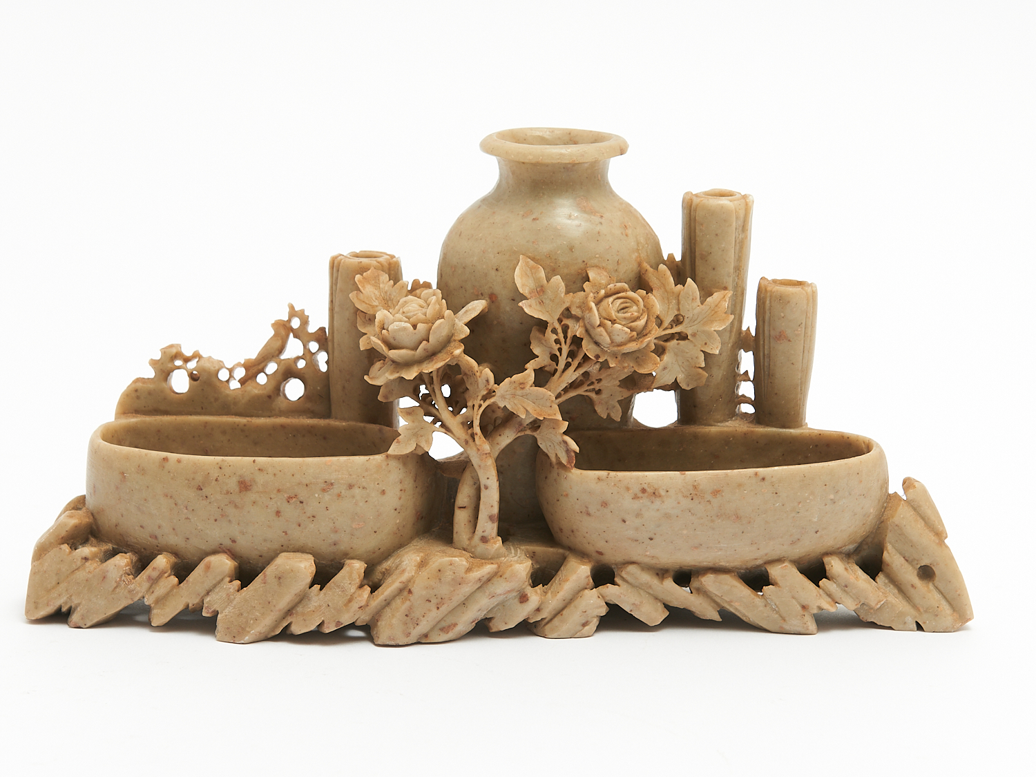 A CARVED SOAPSTONE DOUBLE BRUSH WASHER H.15CM, LEONARD JOEL LOCAL DELIVERY