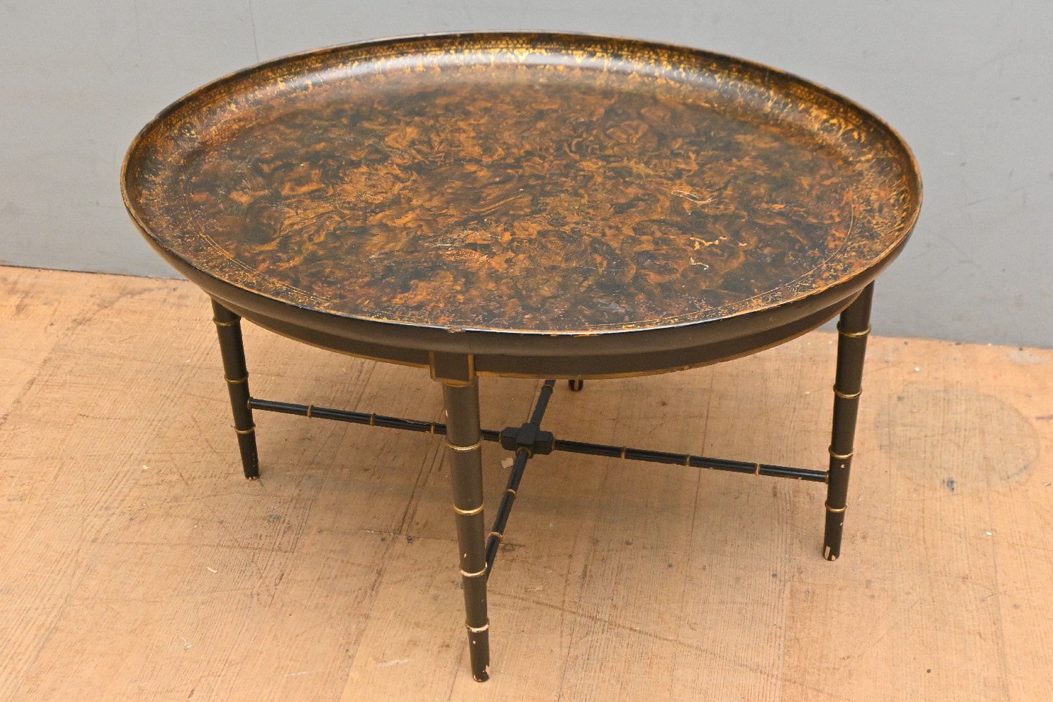 A VICTORIAN LACQUERED PAPIER-MÂCHÉ TRAY ON STAND (A/F) (46CM H X 76CM W X 59CM D)(LEONARD JOEL DELIVERY SIZE: LARGE)