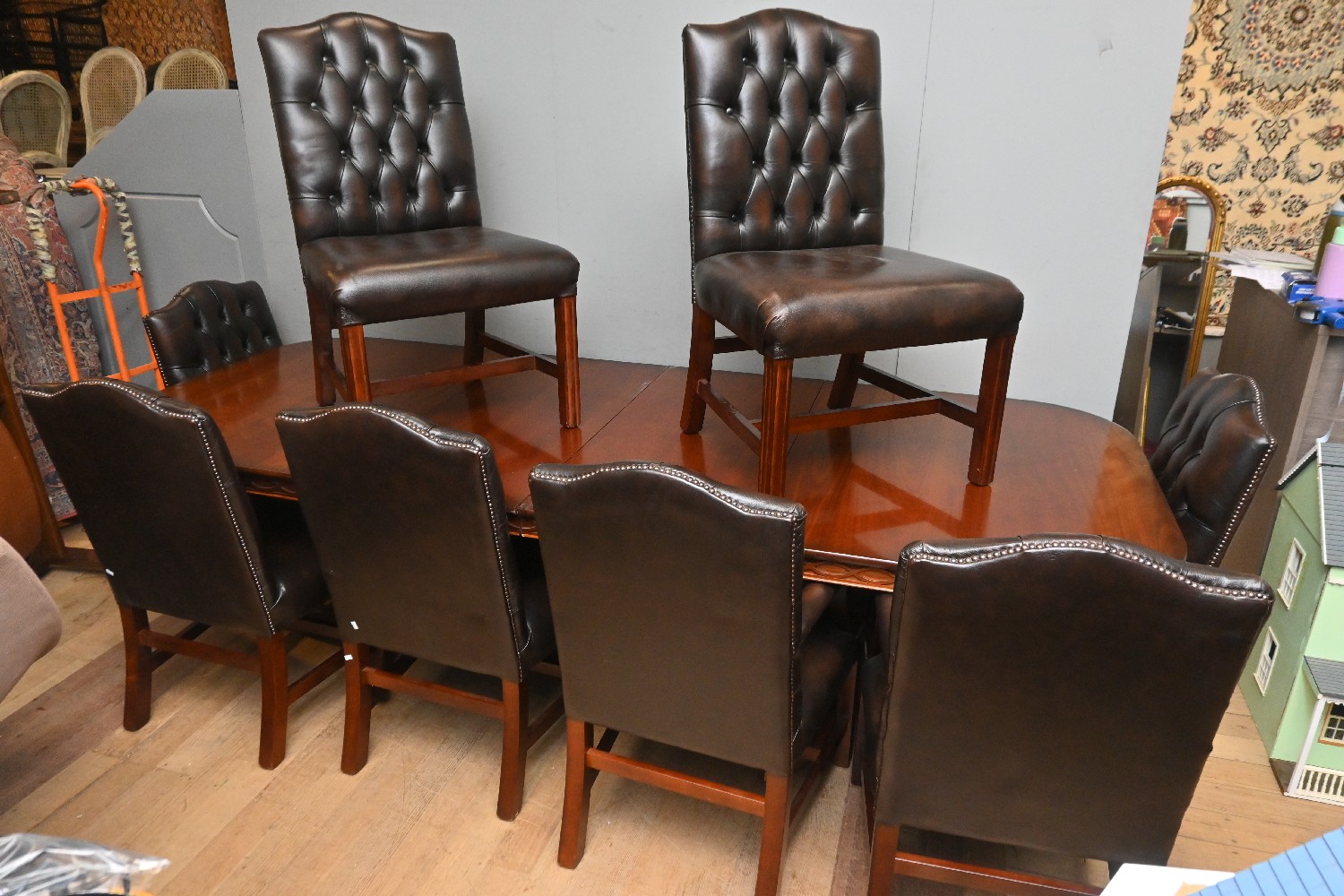 A SET OF TEN LEATHER BUTTON-BACK DINING CHAIRS AND MATCHING DINING TABLE (79CM H X 274CM W X 115CM D EXTENDED) (LEONARD JOEL DELIVERY SIZE: X- LARGE)