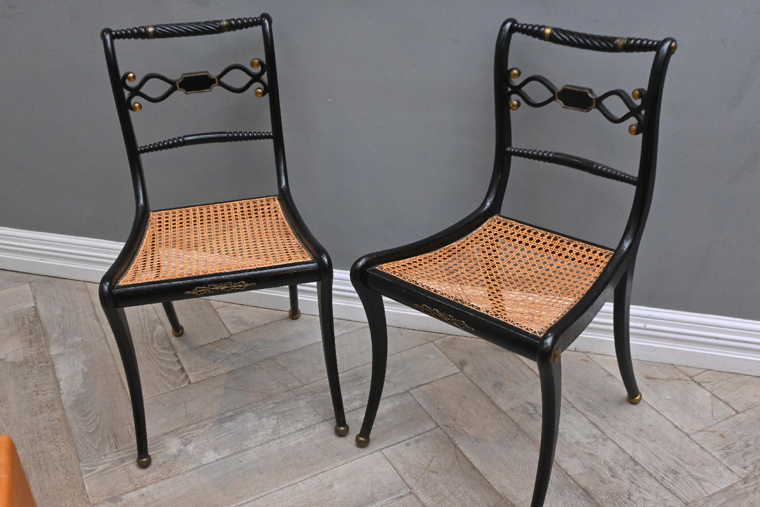 A PAIR OF REGENCY EBONISED SIDE CHAIRS, WITH CANE SEATS AND BRASS INLAY (85CM X W.46CM X D.56CM) (LEONARD JOEL DELIVERY SIZE: X- LARGE)