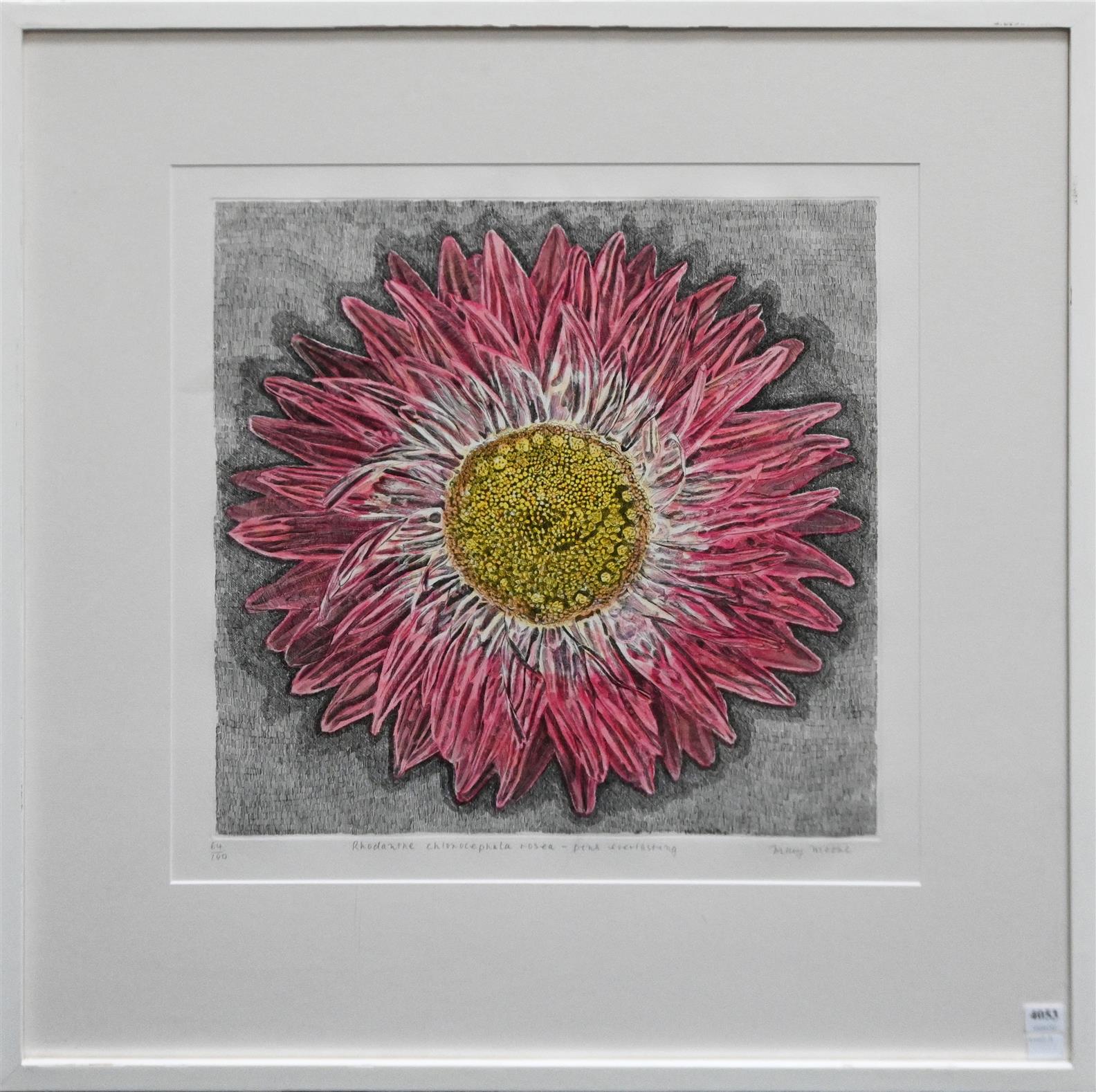 § MARY MOORE, RHODANTHE CHLOROCEPHALA ROSEA - PINK EVERLASTING FROM THE FUSE THAT DRIVES THE FLOWER SERIES 2005, ETCHING ED. 64/100, SIGNED, TITLED AND EDITIONED BELOW IMAGE, 43 X 43CM, FRAME SIZE: 74 X 71.5CM