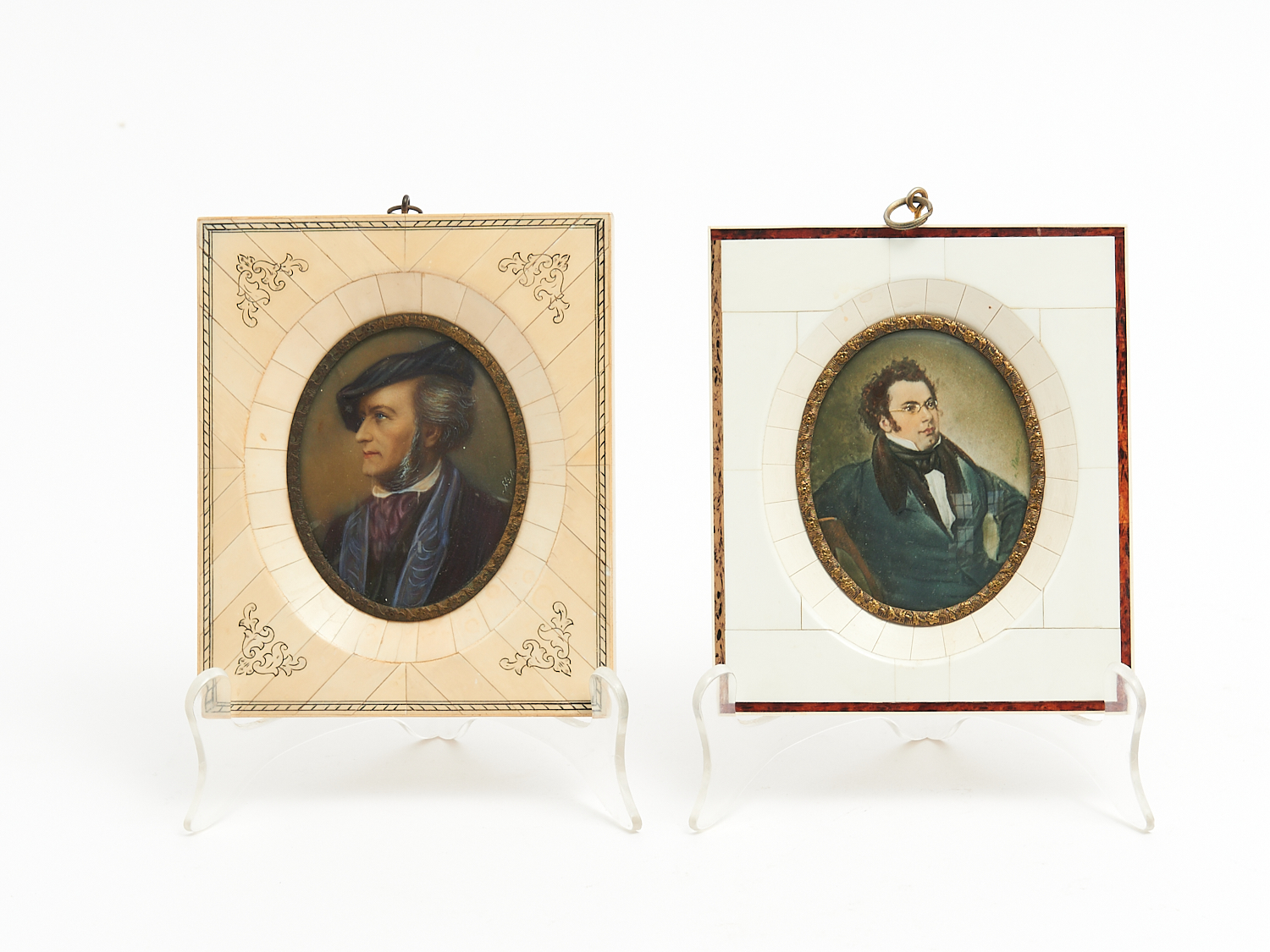 A PAIR OF 19th PORTRAIT MINIATURES OF FRANZ SCHUBERT AND RICHARD WAGNER, EACH POSSIBLY ON A PHOTOGRAPHIC BASE, EACH INDISTINCTLY SIGNED H.14.5CM (TALLEST), LEONARD JOEL LOCAL DELIVERY: SMALL
