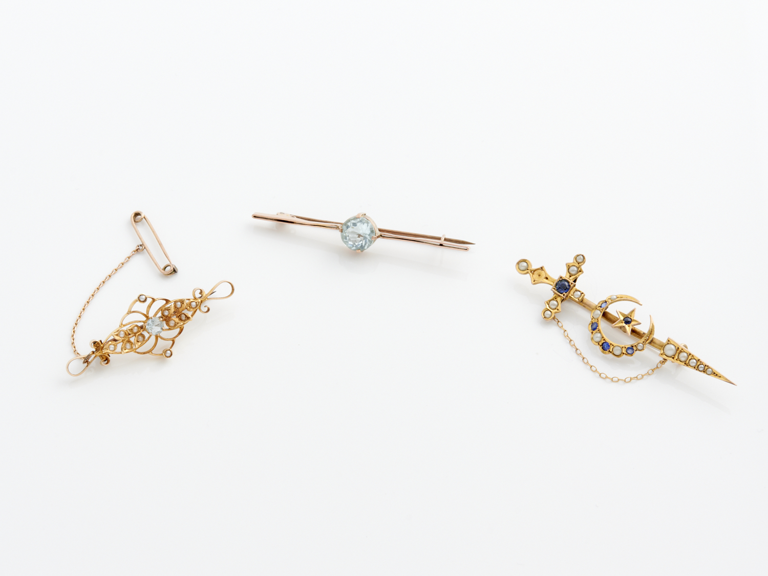 A COLLECTION OF TWO BAR BROOCHES IN 9CT GOLD AND ONE IN 15CT GOLD, INCLUDING SEED PEARL, AQUAMARINE AND PASTE