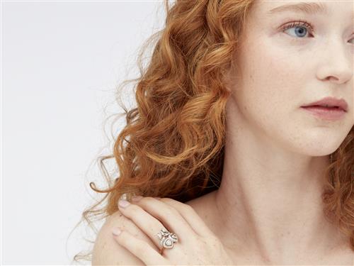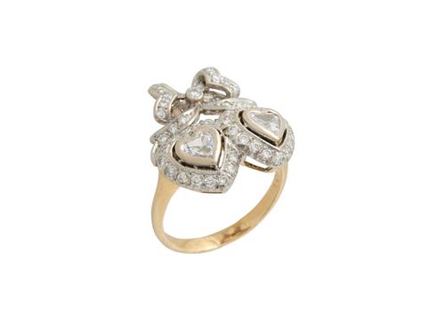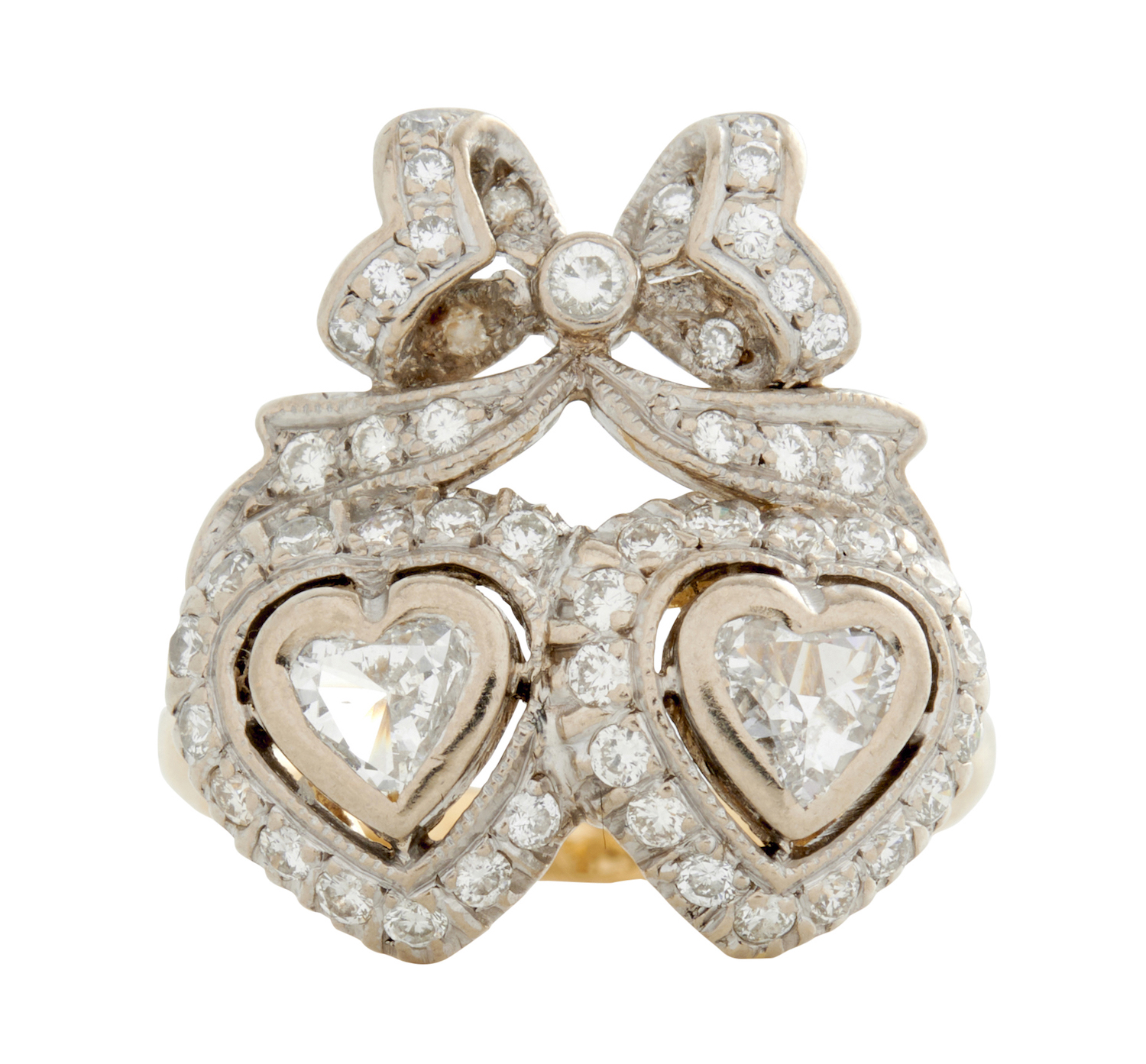 Comprising two collet-set heart-cut diamonds, each within a surround of brilliant-cut diamonds, set below a bow motif set throughout with further diamonds together weighing approximately 0.80 carats, size K.