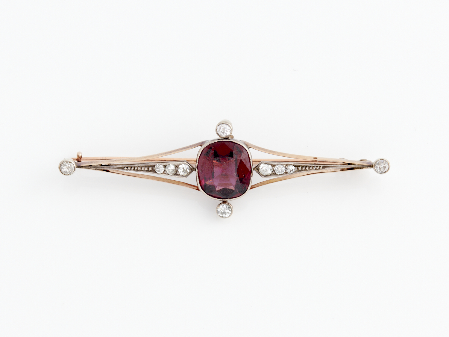 A PASTE AND DIAMOND SET BAR BROOCH IN 15CT GOLD, LENGTH 62MM, 5.4GMS