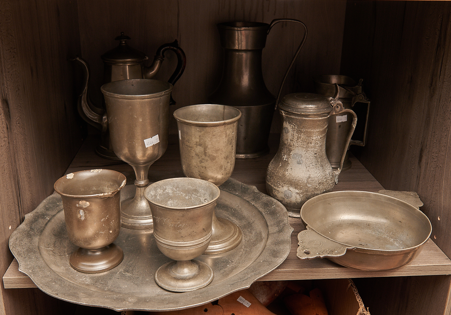 A GROUP OF ASSORTED 18th AND 19th CENTURY ENGLISH AND DUTCH PEWTER INCLUDING JUGS, A TRAY, COFFEE POT, AND GOBLETS H.26CM (TALLEST), LEONARD JOEL LOCAL DELIVERY: MEDIUM