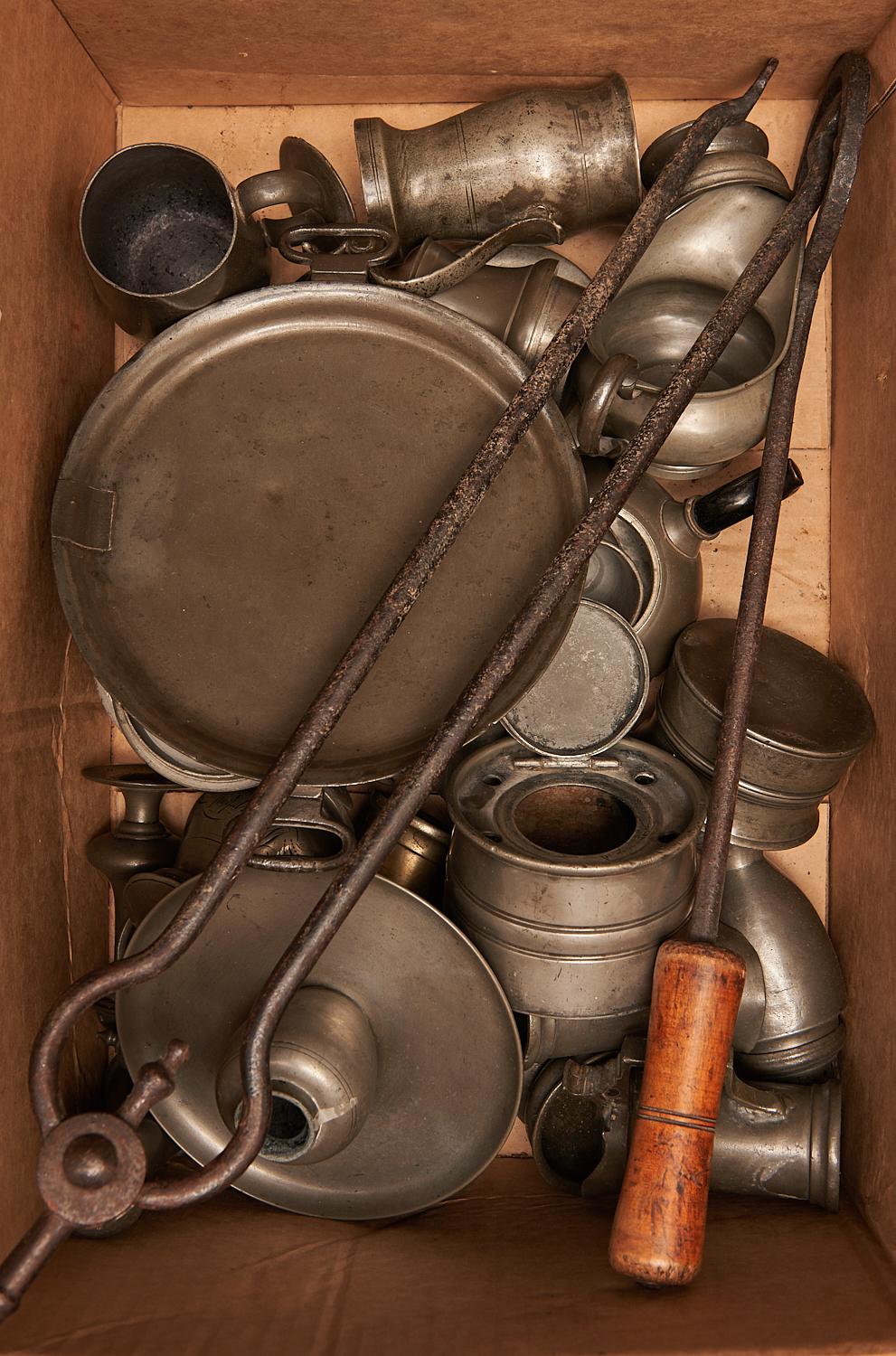 A QUANTITY OF ASSORTED 18th AND 19th CENTURY ENGLISH AND DUTCH PEWTER INCLUDING MEASURES, MUGS, DISHES, CASTERS, AND INKWELLS L.61CM (LONGEST), LEONARD JOEL LOCAL DELIVERY: MEDIUM