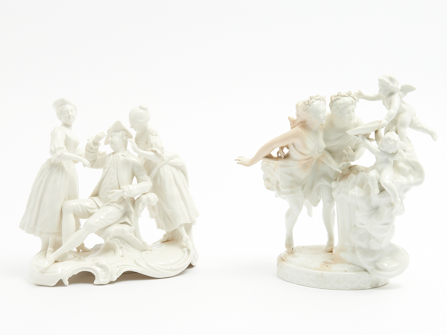 A HOCHST PORCELAIN FIGURAL GROUP, TOGETHER WITH A NYMPHENBURG FIGURAL GROUP H.20CM (HOCHST GROUP) (BOTH A/F), LEONARD JOEL LOCAL DELIVERY: LARGE.