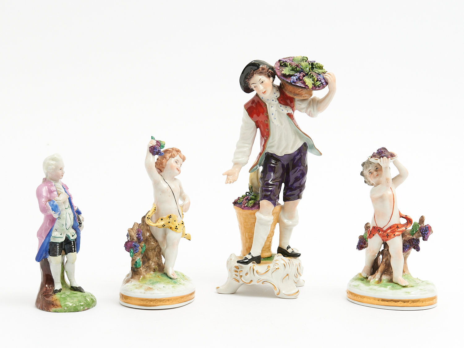 THREE PORCELAIN BACCHANALIAN FIGURES TOGETHER WITH A FRENCH COURT FIGURE, THE LARGEST 22CM HIGH, LEONARD JOEL LOCAL DELIVERY: MEDIUM