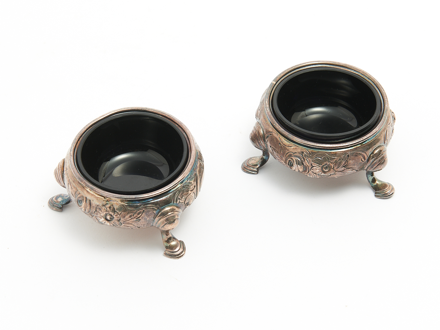 A PAIR OF GEORGIAN STERLING SILVER SALTS WITH COBALT BLUE GLASS LINERS DIA.7CM, 128G (SILVER), LEONARD JOEL LOCAL DELIVERY: SMALL