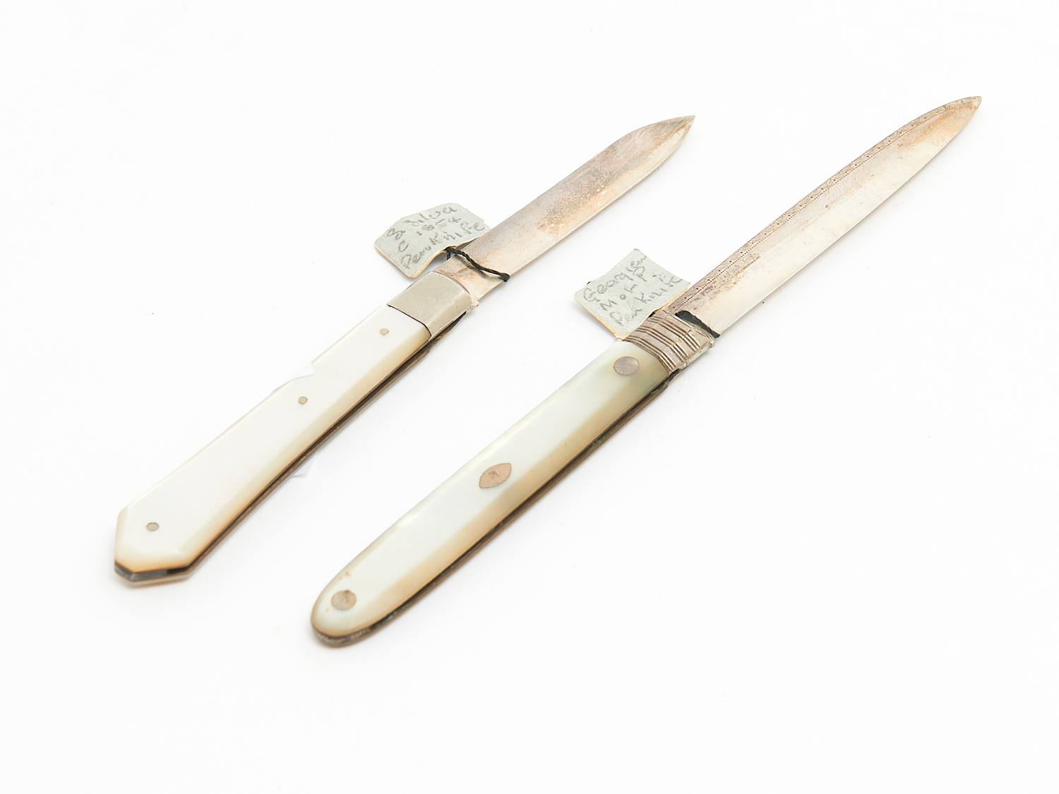 TWO STERLING SILVER AND MOTHER-OF PEARL PEN KNIVES, ONE GEORGIAN AND THE OTHER VICTORIAN L.8CM (LONGEST), LEONARD JOEL LOCAL DELIVERY: SMALL